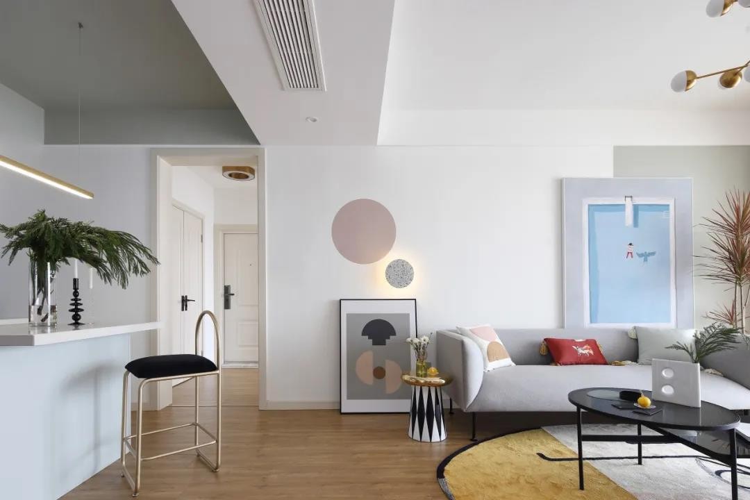 沙發(fā)墻潔凈的墻面加入白色與灰色的雙色設(shè)計,掛放一幅極簡的掛畫,左側(cè)還有兩盞圓形的壁燈。灰色布藝沙發(fā),還有鮮艷活
