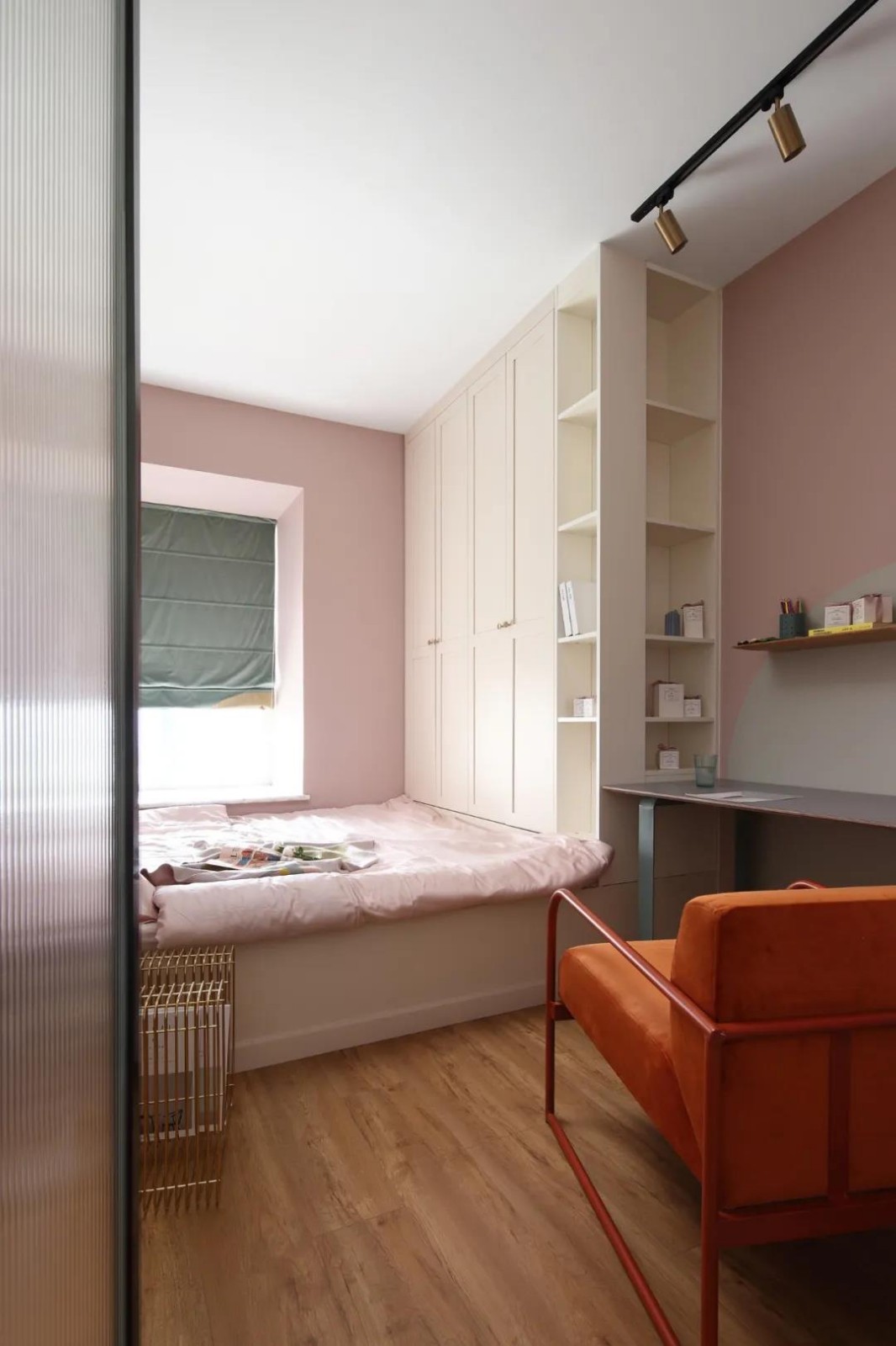 書房在粉色的墻面空間下,布置粉色床單,以象牙白的定制榻榻米、衣柜相呼應(yīng),在書桌旁邊的衣柜加入開放書架,整體空間的收納更加實用靈活。