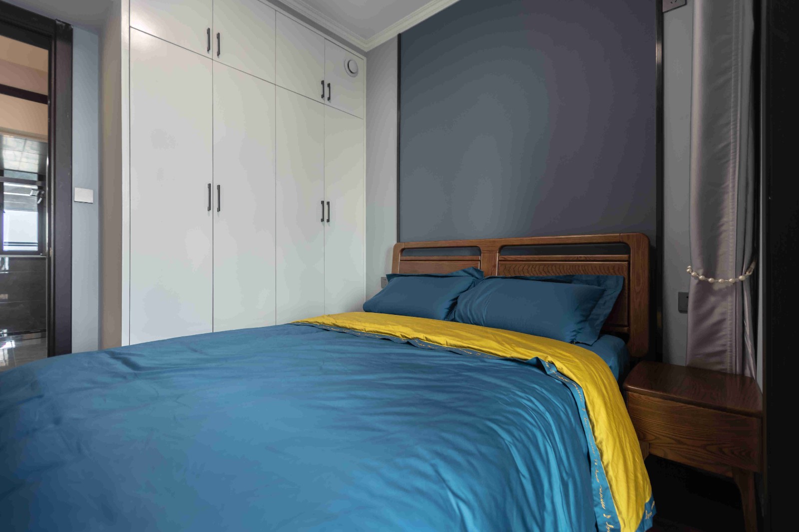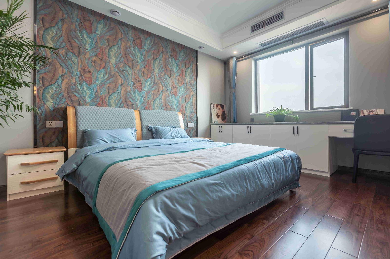 在原戶型的基礎(chǔ)上,并沒(méi)有做太多的改動(dòng)。靠窗增加了一排定制柜子,既能做梳妝臺(tái)又能放置東西。最引人注目的是床頭背景墻,充滿了藝術(shù)氣息,深邃幽遠(yuǎn)。