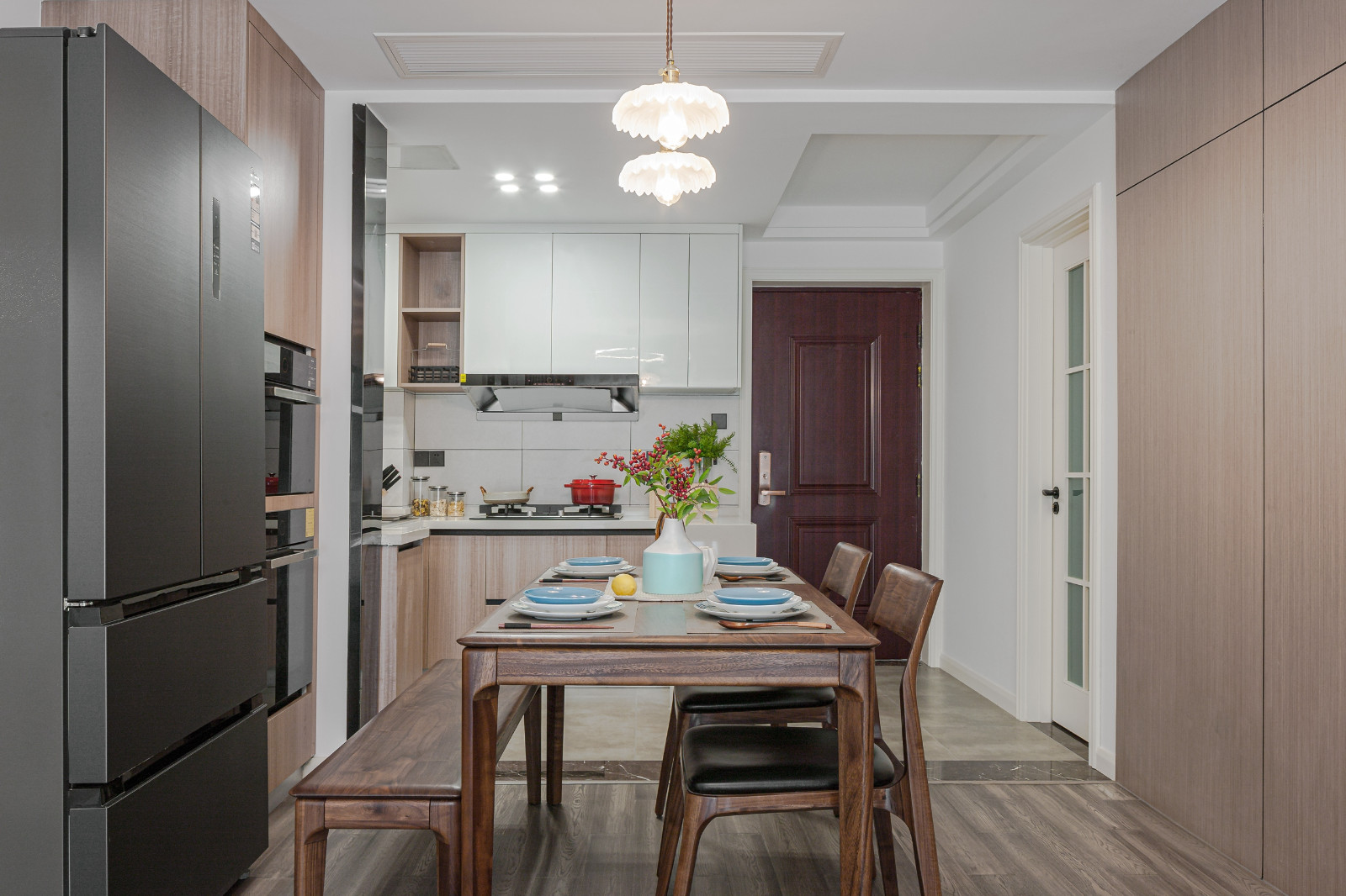 餐邊靠墻延伸廚房承重墻的厚度,做櫥柜高柜以及嵌入式冰箱,合理規劃空間,美觀實用。